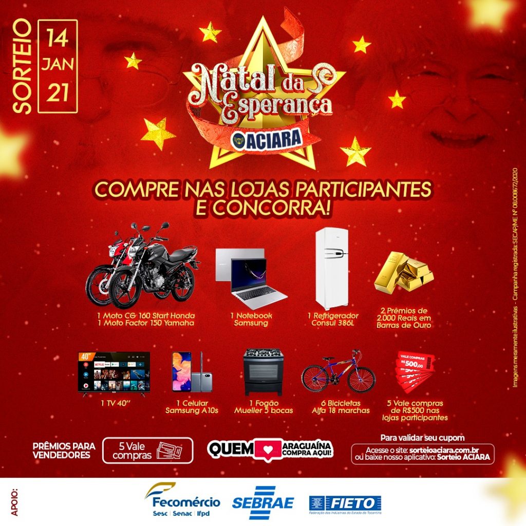 O Natal já passou, mas a promoção da Associação Comercial e Industrial de Araguaína (Aciara) que vai sortear 20 prêmios continua. A Campanha Natal da Esperança é a grande aposta do comércio para reaquecer as vendas neste início de ano. O cliente tem até o dia 14 de janeiro para participar do grande sorteio.