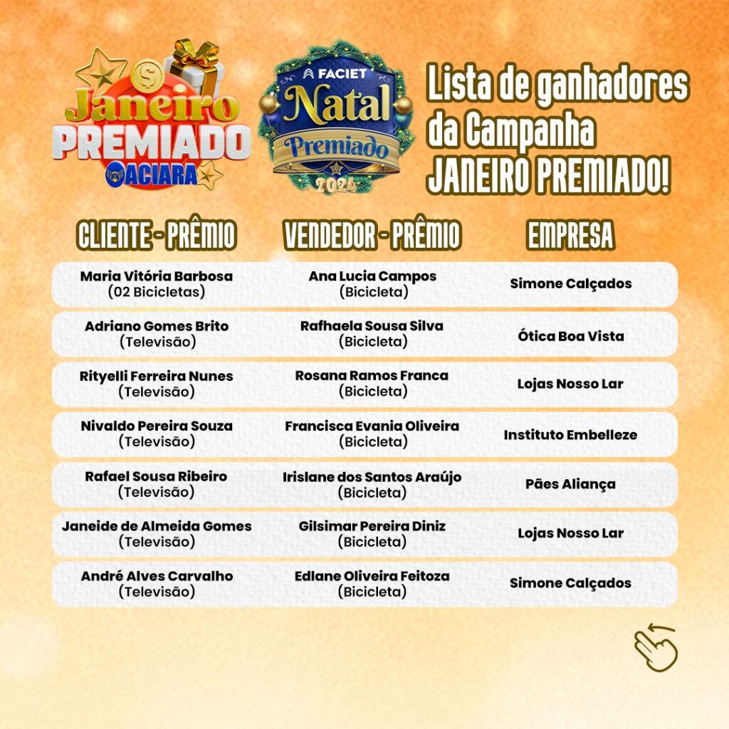 “A campanha manteve as vendas aquecidas neste mês de janeiro e é resultado da parceria, sempre bem-sucedida, com a FACIET. Agradeço ao Fabiano do Vale por possibilitar a realização desta promoção. Também agradeço o fomento do Governo do Estado, o apoio da Prefeitura de Araguaína e a confiança que parceiros depositaram nesta campanha: Mob Pro, Sicredi e Fecomércio. E uma gratidão a todos os comerciantes e clientes que decidiram participar desta campanha”, destacou o presidente Fábio.