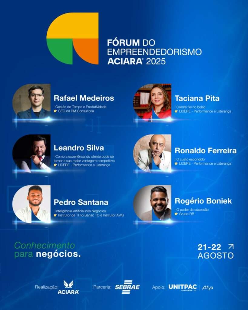 Iniciou nesta terça-feira, dia 05, as inscrições gratuitas para o Fórum do Empreendedorismo ACIARA, que será realizado nos dias 21 e 22 de agosto, no auditório do Unitpac. O evento, que tem o apoio do Sebrae, faz parte das ações de comemoração dos 50 anos da Associação Comercial e Industrial de Araguaína. O objetivo é promover um espaço de conhecimento, network e capacitação.